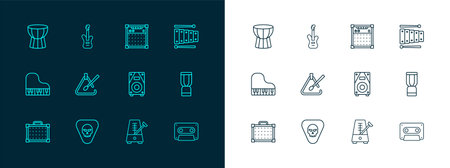 Set line Xylophone Guitar pick Stereo speaker Metronome with pendulum Triangle musical instrument amplifier African darbuka drum and Electric bass guitar icon. Vector.