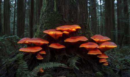 Vibrant orange mushrooms glowing at the base of a tree in a lush forest, surrounded by ferns