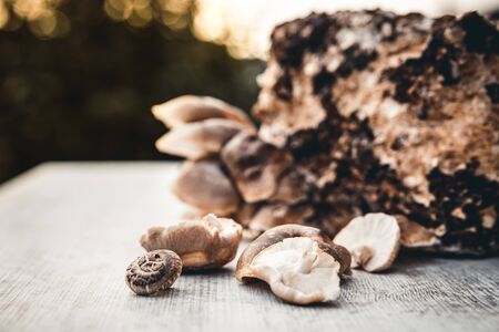 Fresh shiitake mushrooms growing up on mycelial block, homemade cultivation