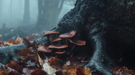 Mushrooms growing on a moss-covered tree trunk in a dense, dark forest, creating a mysterious and enchanting woodland atmosphere