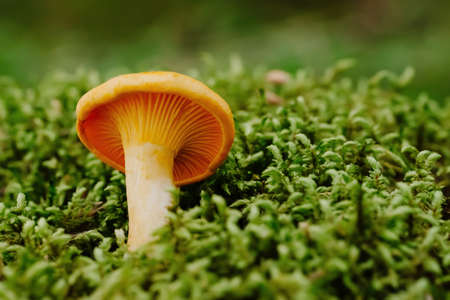 An edible mushroom on the green grass. Close-up of a chanterelle mushroom in the forest.