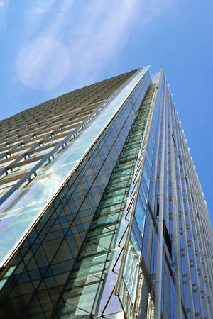 Modern office building with glass facade on a clear sky background. Abstract close up of the glass-clad facade of a modern building covered in reflective plate glass.