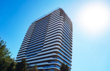 Unusual angle of the underside of a modern apartment building in Downtown Brooklyn, NY, USA