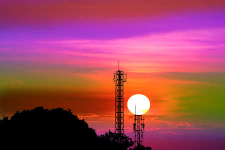 sunset on colorful evening sky and silhouette signal pole and mountain