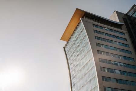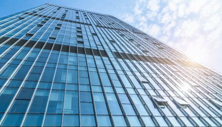 Modern glass facade against blue sky. Bottom view of a building in the business district. Low angle view of the glass facade of an office building.