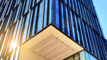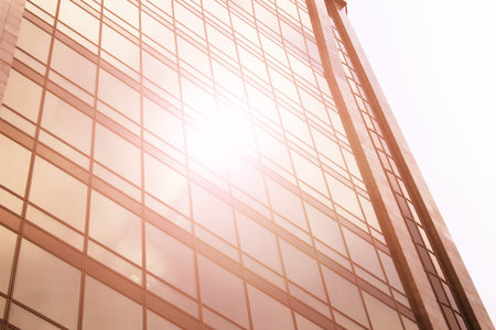 Bottom view of office building window close up with sunrise, reflection and perspective. Modern architecture with sun ray. Glass facade on a bright sunny day with sunbeams on the blue sky.