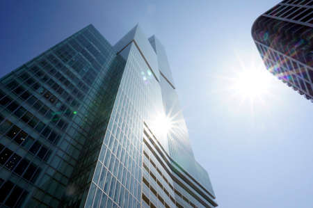 Downtown corporate business district architecture. Glass reflective office buildings against blue sky and sun light. Economy, finances, business activity concept.