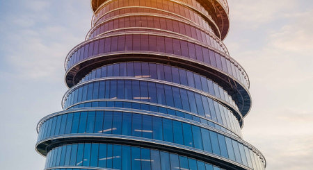 A modern skyscraper with a unique spiral design against a cloudy sky