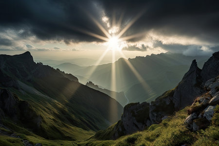 majestic mountain range, with clouds hovering above, and the sun peeking through, created with generative ai