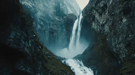 the photo showcases a mesmerizing waterfall in a dark and foreboding landscape. with its photorealistic artistry and birds-eye-view perspective, this 32k uhd image captures the beauty and intricacy of the norwegian nature. the composition exudes a sense of mystery and awe, immersing viewers in the photorealistic detail of the cascading waterfalls. ai generated