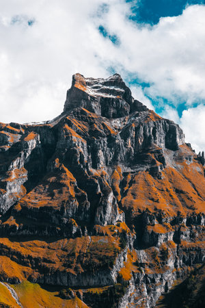 Majestic mountain peak with steep rocky surfaces, adorned with orange autumn foliage, standing tall under a vibrant blue sky and fluffy clouds.