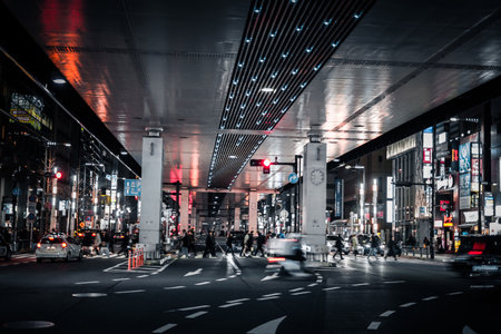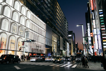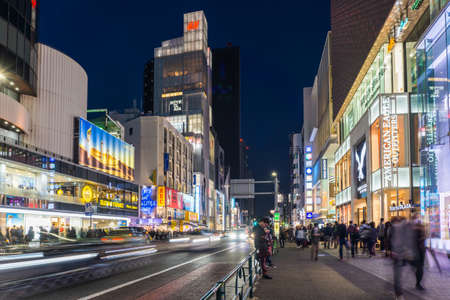 Tokyo, Japan - October 26, 2019: The evening view of busy street of Ginza shopping area, surrounded by the many shops, department stores, boutiques and restaurants icons. Chuo. Tokyo. Japan