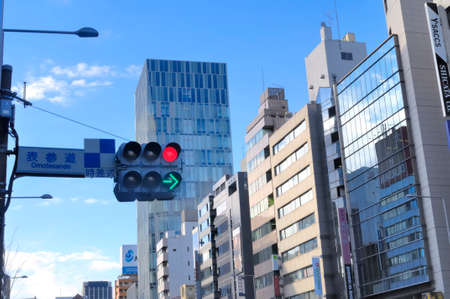 TOKYO, JAPAN, JANUARY - 2019 - Traffic light and buildings at background at ginza district, tokyo, japan