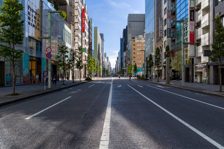 TOKYO, JAPAN - JULY 30 2023: Roads closed for pedestrians and shoppers in the high end shopping Ginza area of Tokyo.