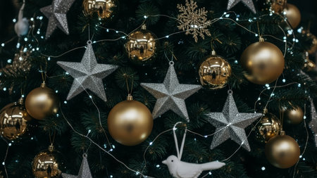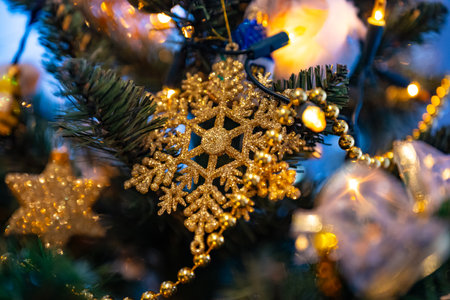 Christmas tree decorated with golden snowflakes and garlands, close up