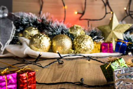 Wooden table with Christmas decorations. Red, silver and gold balls, gift boxes, lights, panettone, Christmas tree and others. Selective focus.