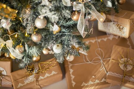 Festive decorated fir-tree in living room with wrapped Christmas gifts. Fir branches and warm garland lights bokeh on foreground.