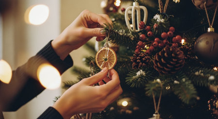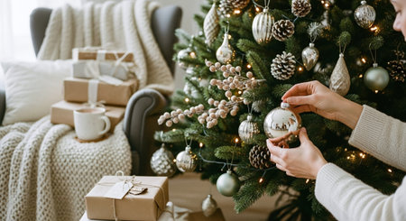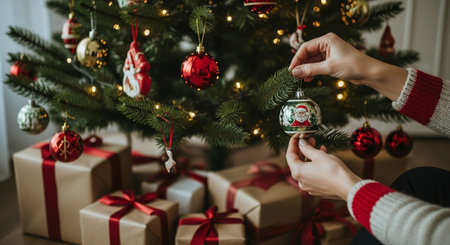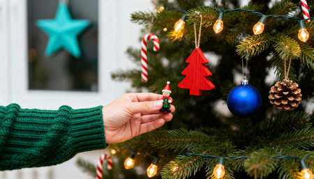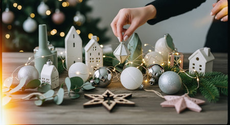 The picture of the family member is setting up holiday decorations, with the focus on their hands and the festive decor of christmas holiday, creating warm atmosphere with home cozy lighting. AIG43.