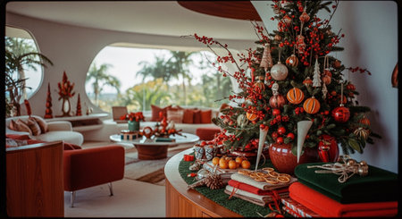 A cozy living room for christmas, featuring a beautifully adorned tree, a warm orange sofa with pillows, a coffee table with books and oranges, and festive lights
