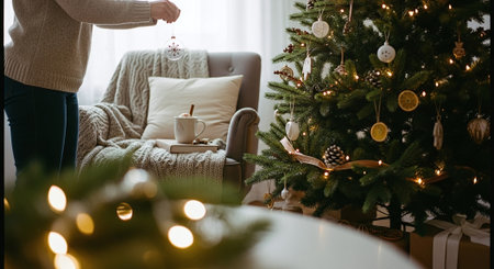 A cozy living room decorated for Christmas, featuring a beautifully adorned Christmas tree, a person hanging an ornament, and a comfortable chair with blankets