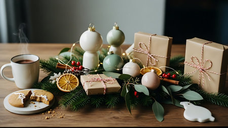 A cozy holiday scene featuring a decorated christmas tree, wrapped gifts, a cup of hot chocolate with whipped cream, and a vase with greenery on a wooden table