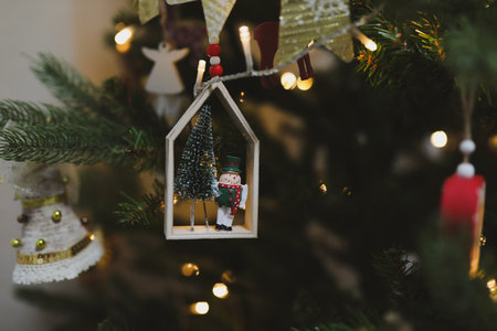 Beautiful Christmas decorations hanging on a Christmas tree. Home decoration for Christmas.