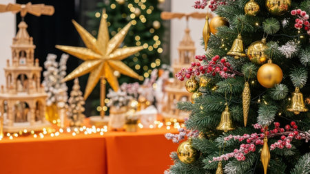 Christmas tree decorated with golden ornaments and garlands on blurred background