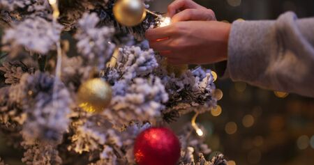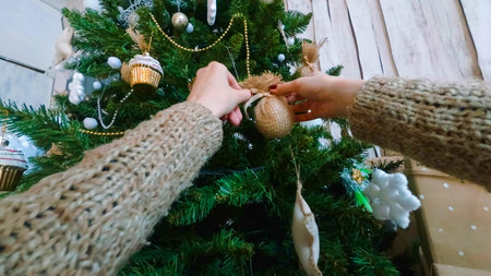 Woman decorating christmas tree with toys. Point of view shot. Holidays, celebration and christmas concept