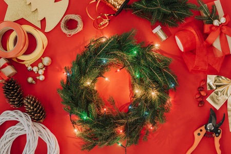 flat lay with pine tree branches, christmas lights and ribbons for handmade christmas wreath on red backdrop