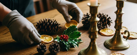 Woman decorator gloved hand arranging dried orange, pine cone, and holly on wooden table for Christmas celebration. A natural holiday decoration concept.