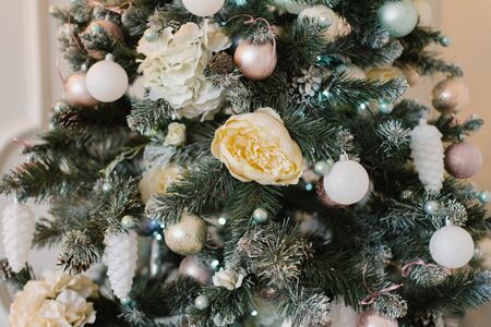 Decorated for Christmas or new year spruce, close-up of branches and toys on them