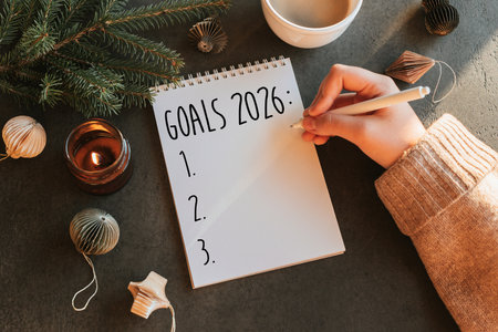 Woman's hand writing 2026 Goals in notebook. Fir tree, candle, cup of coffee and decoration on table. Top view, flat lay. New year's Resolution