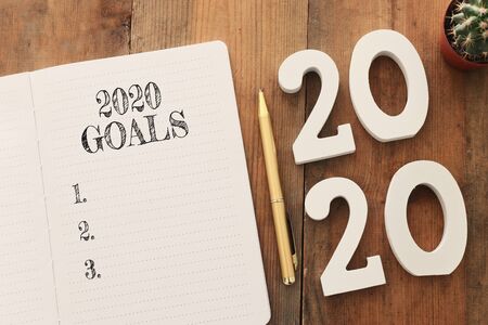 Business concept of top view 2020 goals list with notebook over wooden desk