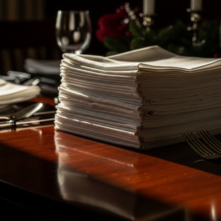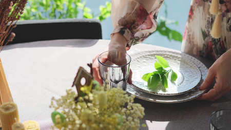 Close-up of people arranging napkins and cutlery on a wooden dining table. The scene depicts the preparation for a formal dinner or gathering, featuring wine glasses and small plant centerpieces in a bright, inviting atmosphere.