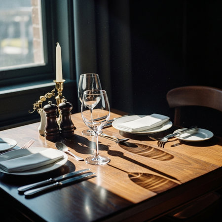 A beautifully arranged dining table featuring elegant plates and glassware, bathed in soft natural light, perfect for a cozy meal gathering.