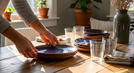 A woman's hands place handcrafted ceramic plates on a wooden dining table, preparing for a meal. The setting includes glasses and bowls, bathed in warm natural light, suggesting a cozy and welcoming home environment.