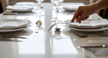 Close-up of a waiter's hand setting a formal dining table with a fork and a white napkin. The bright, reflective surface and precise arrangement suggest a high-end restaurant or banquet preparation.