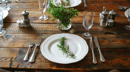 A minimalist dining setting showcasing a white plate with a fresh herb centerpiece, complemented by elegant glassware and natural decor elements on a stylish marble table.