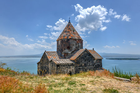 Scenic view of an old Sevanavank church in Sevan, Armenia on sunny day blue sky and fluffy clouds