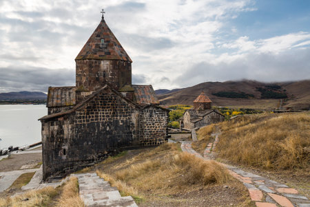 View of Sevanavank in Armenia, a monastic complex located on a peninsula at the shore of Lake Sevan in the Gegharkunik Province of Armenia