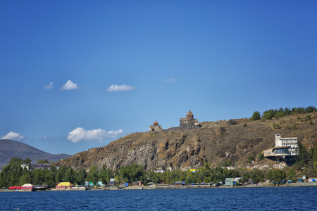 Scenic view of an old Sevanavank church in Sevan, on sunny day . Armenia