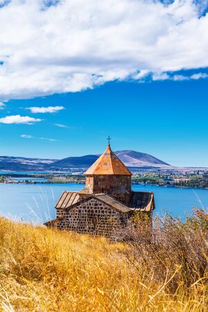 Scenic view of an old Sevanavank church in Sevan, Armenia on autumn day, blue sky
