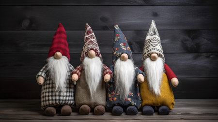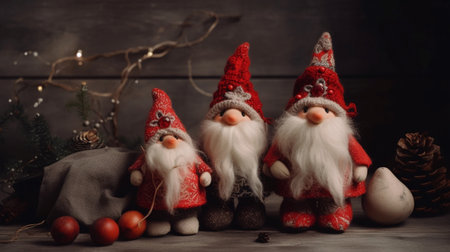 Handmade Christmas gnomes on a wooden background. Selective focus.
