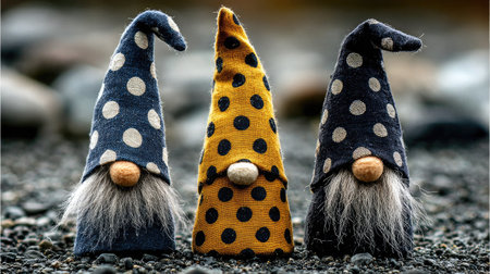 Three ornamental gnomes are captured in a medium shot, showcasing their whimsical design. They are dressed in different colors of fabric with polka dots and textured patterns. The background is blurred, and the image is lit to create a warm atmosphere, suitable for various decorative or commercial applications.
