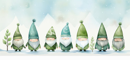 Christmas greeting card with cute gnomes. Watercolor vector illustration.