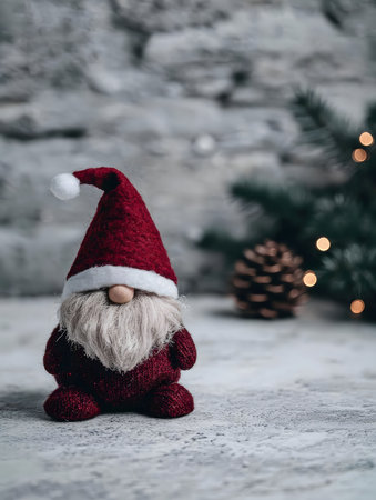 A charming red knitted Christmas gnome sits on a rustic background. Perfect for holiday decor.