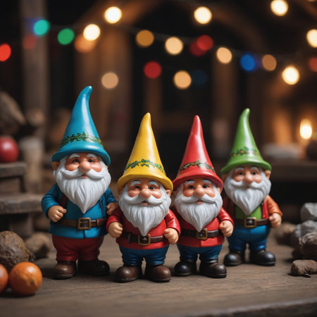 An AI generated illustration of a group of cheerful garden gnomes in a lush garden