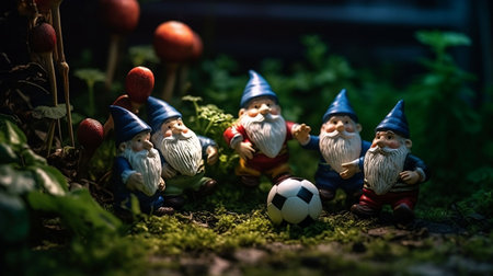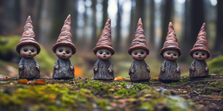Toy dwarves in forest. Cute figures of garden gnomes in woodland. Generative AI
