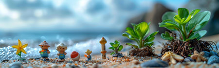 A group of small figurines are on a beach, with a few of them holding fishing rods