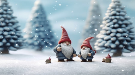 Christmas and New Year concept. Cute little gnomes on snow background.
